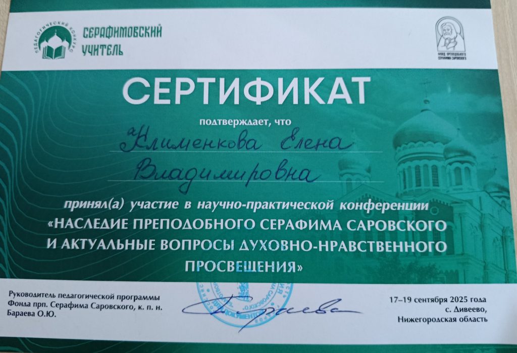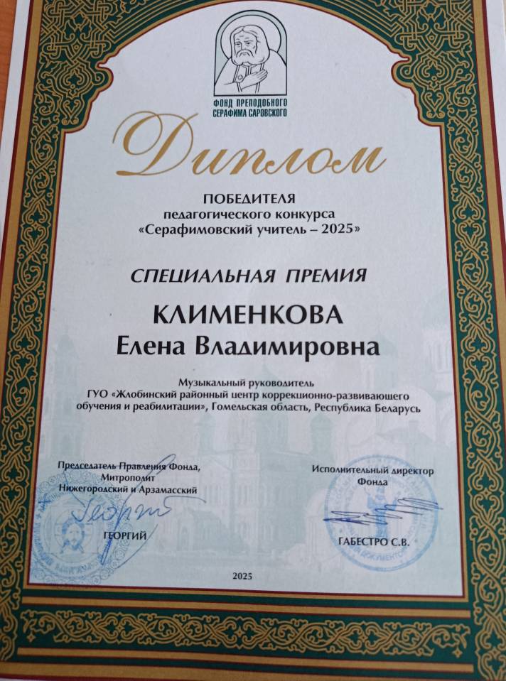 В конце марта музыкальный руководитель ГУО «Жлобинский районный ЦКРОиР» Клименкова Е.В. под руководством заместителя директора по основной деятельности Алексеенко Г.Ю. приняли участие в конкурсе «Серафимовский учитель», который проводился Благотворительным фондом преподобного Серафима Саровского для педагогических работников из Российской Федерации и стран ближнего зарубежья. По итогам конкурса Клименкова Елена Владимировна награждена специальной премией и дипломом. Вручение наград проходит 16, 17, 18 сентября 2025 года в Свято-Троицком Серафимо-Дивеевском монастыре с.Дивеево Дивеевского района Нижегородской области. Наш центр представляют педагоги Клименкова Е.В. и Нагорная И.И.